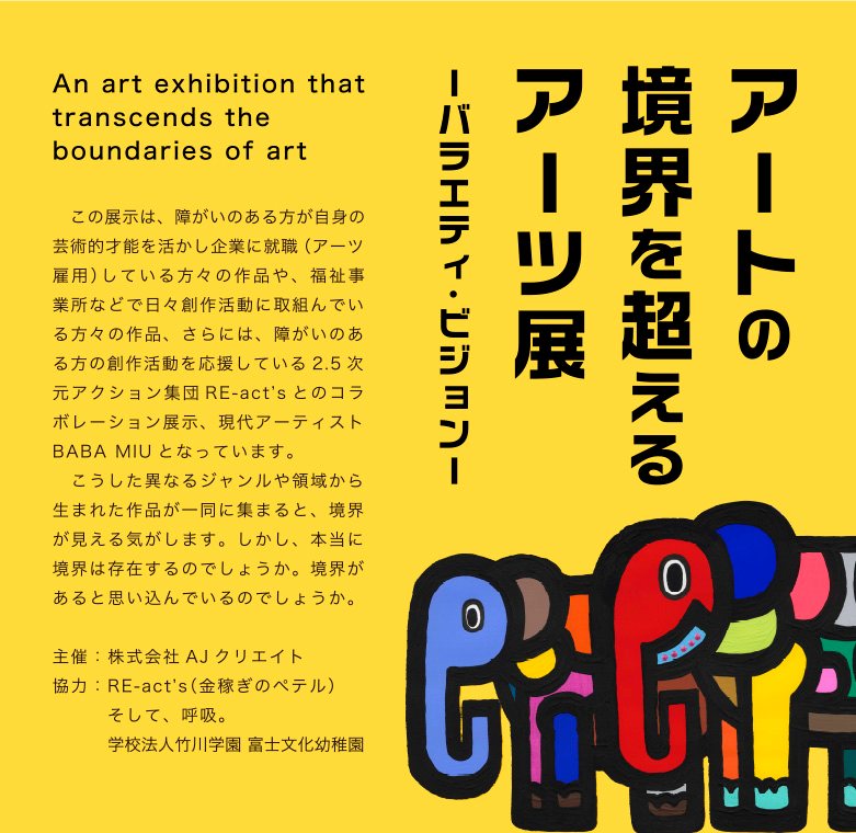 この展示は、障がいのある方が自身の芸術的才能を活かし企業に就職(アーツ雇用)している方々の作品や、福祉事業所などで日々創作活動に取組んでいる方々の作品、さらには、障がいのある方の創作活動を応援している2.5次元アクション集団RE-act’sとのコラボレーション展示、現代アーティストBABA MIUとなっています。